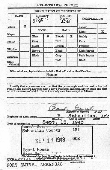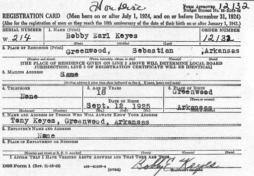 September 13, 1943 Bobby registered for the military draft at Fort Smith, Sebastian Co.,