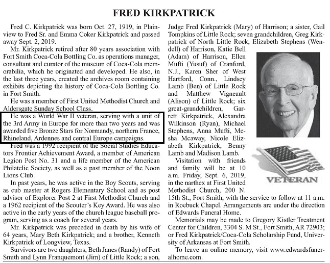 Fred C. Kirkpatrick was born on October 27, 1919 in Plainview (Yell County) Arkansas to Fred Sr.