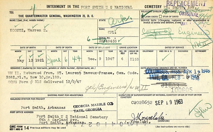 Dec 9, 1947 Cpl. Koontz body transferred from France to Ft Smith, Sebastian, Ar.