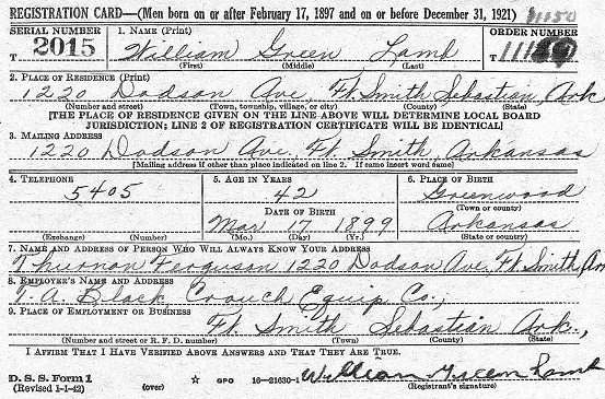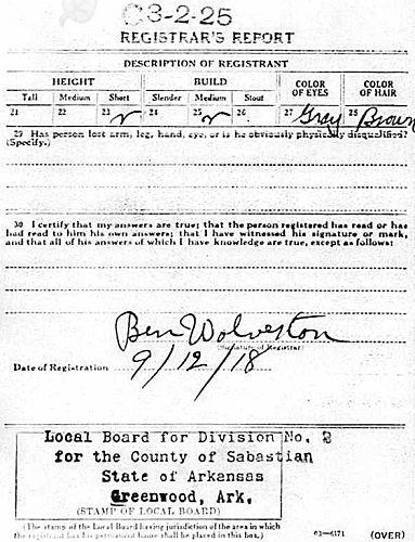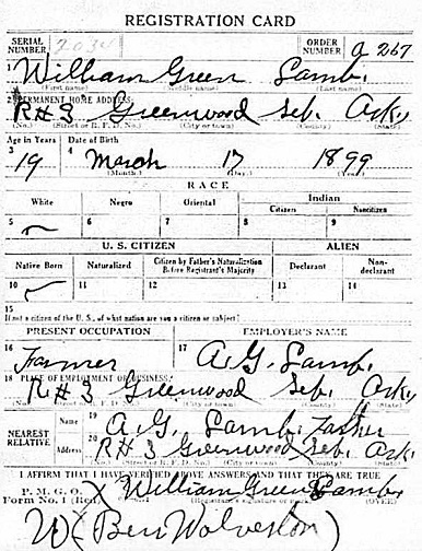 Bill registered for the military draft on Sept 12, 1918 at Greenwood, Sebastian Co,