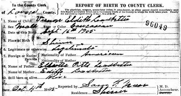 Vernon Eldith Leadbetter was born 16 Sep 1905 in Shiner, Lavaca Co., Texas.