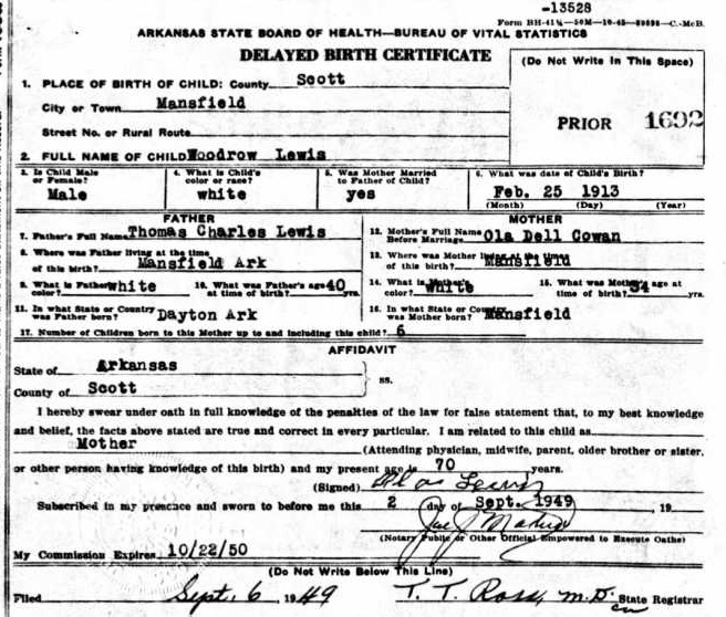 Woodrow Wilson Lewis was born 27 Feb 1914 in Mansfield, Scott Co., Ar. to