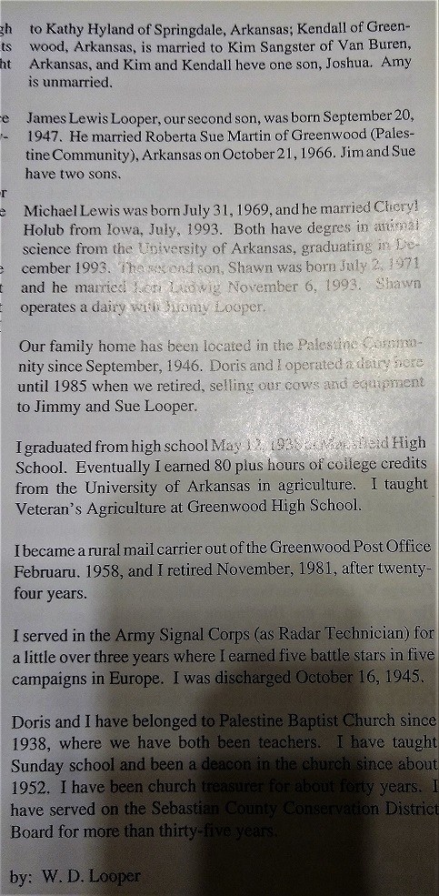 World War II, a member of VFW, a deacon and member of Palestine Baptist Church, the Soil Conservation District, Gideons International, the Sebascott Economic Development Council and the widower of Doris Looper.