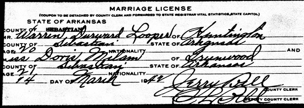 married Doris Milam of Greenwood. Warren resided in Huntington, Sebastian Co., Ar.