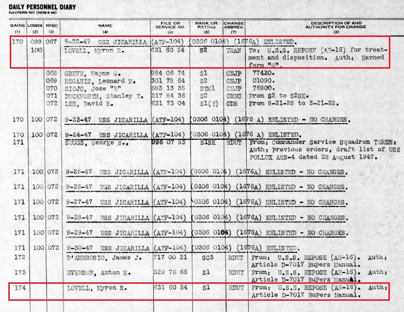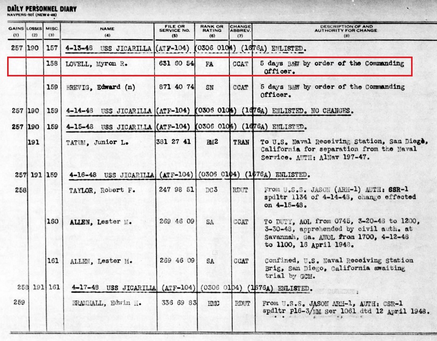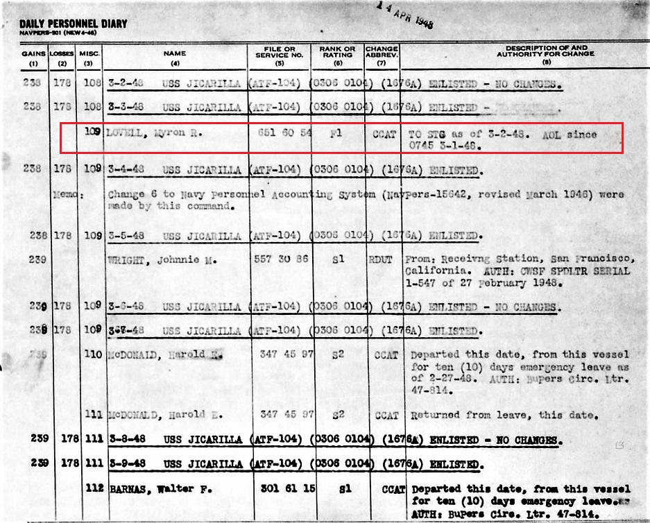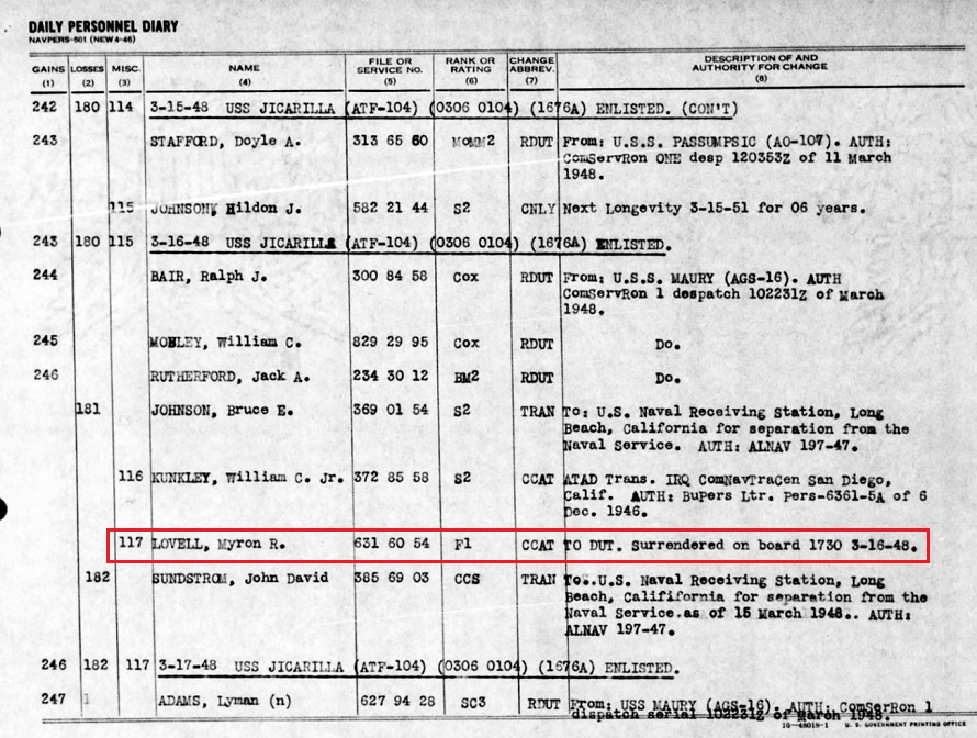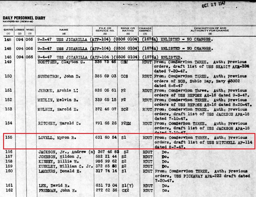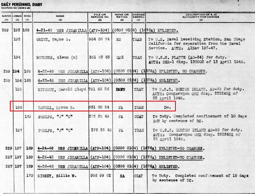 (From the 1st muster from the Jicarilla below it appears he served on the USS Mitchell before Jicarilla.)