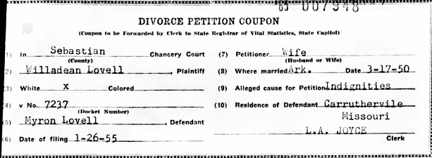 married in Crawford Co., Ar. They divorced January 26, 1955. His second wife was