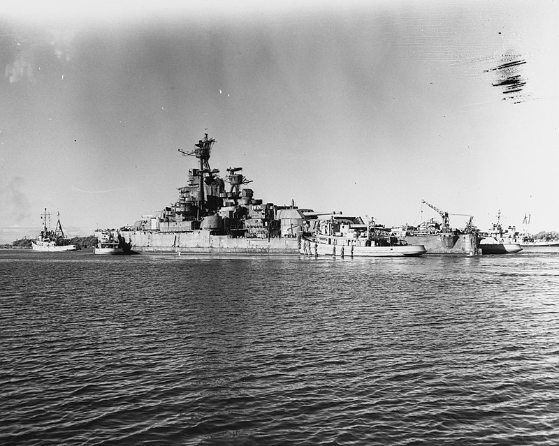 USS Jicarilla towing USS Nevada with a big torpeda hole in her side in 1948