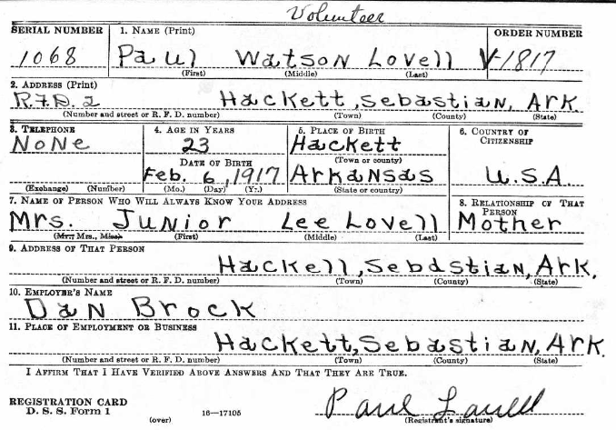 Paul Watson "Watt" Lovell was born February 6, 1916 in Hackett, Sebastian Co., Ar. to