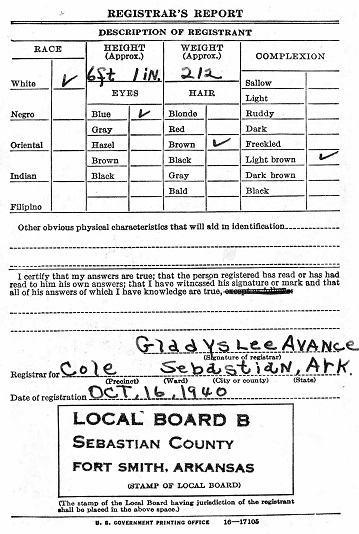 October 16, 1940 he registered for the military draft at Fort Smith, Sebastian Co., Ar. and