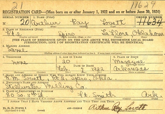 Arthur Ray Lovett was born 7 Feb 1922 at LeFlore Co., Ok. to
