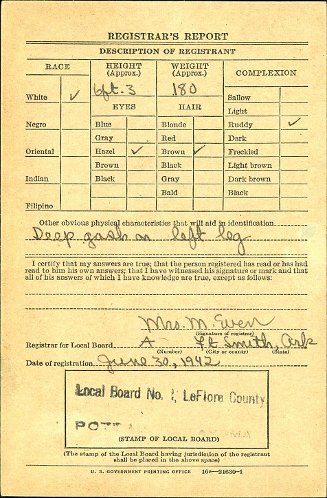 Arthur registered or the draft on June 30, 1942 in Sebastian Co., Ar.