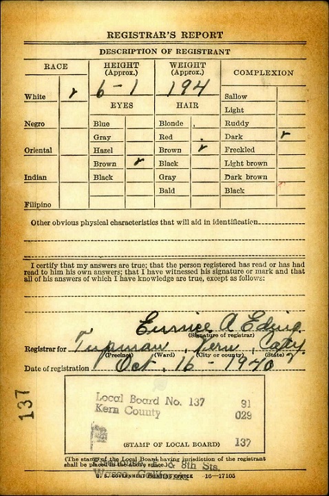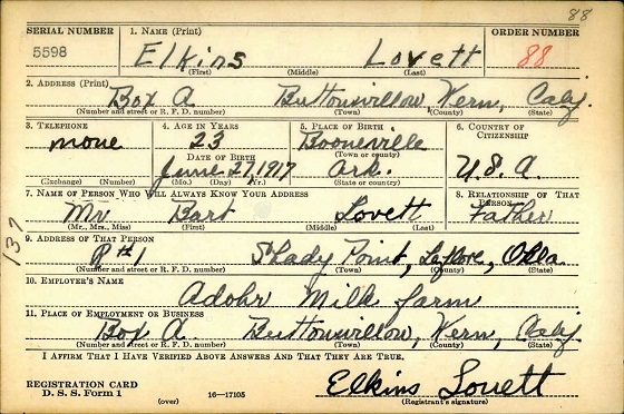 October 16, 1940 Elkins regristered for the draft in Kern Co., Calif and