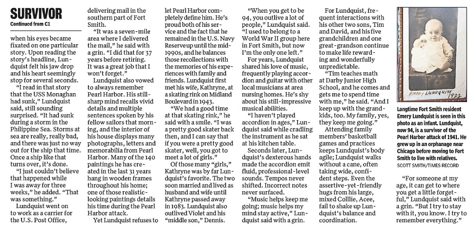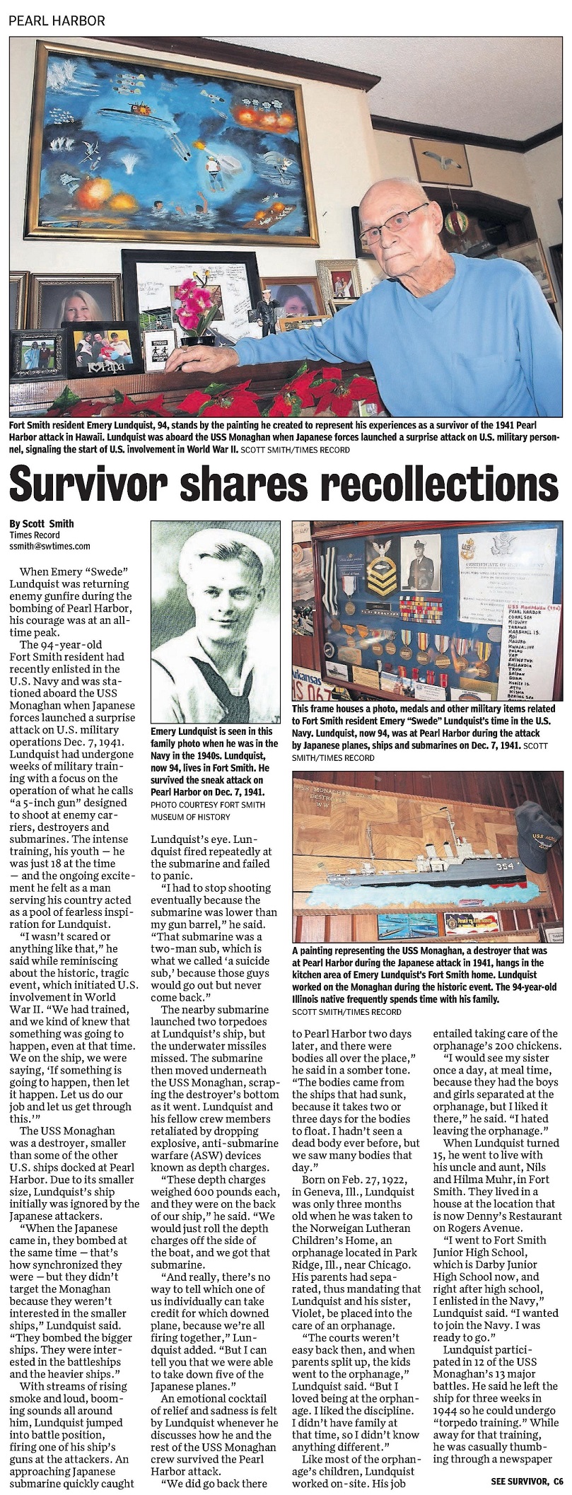 EL: You know, I told you I was from Sweden. There's people from Sweden heard about me being in Pearl Harbor. I've got a newspaper clipping that they said that's hanging on the board, in Swedish.