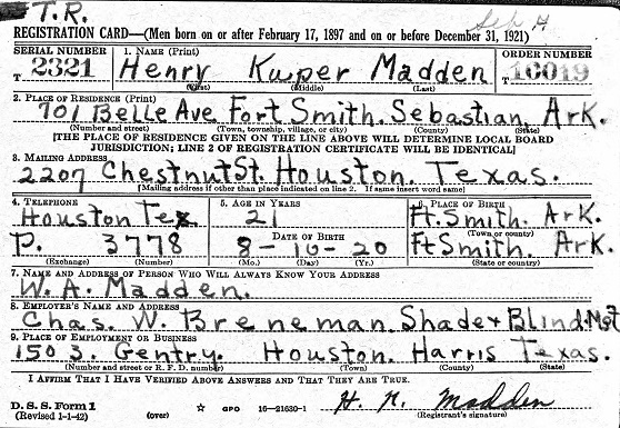 Henry Kuper Madden was born August 10, 1920 in Fort Smith, Sebastian Co., Ar. to