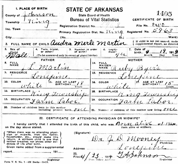 Audra Myrl Martin was born April 19. 1914 at Long Pine, Johnson Co., Ar. to