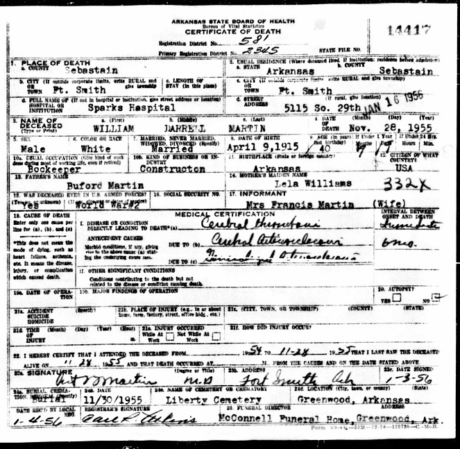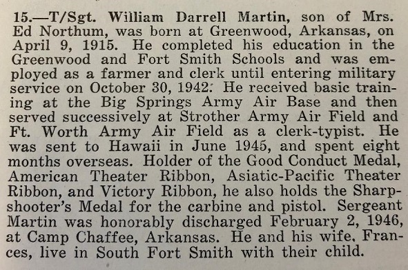 William Darrell Martin was born April 9, 1915 at Fort Smith, Sebastian Co., Ar. to