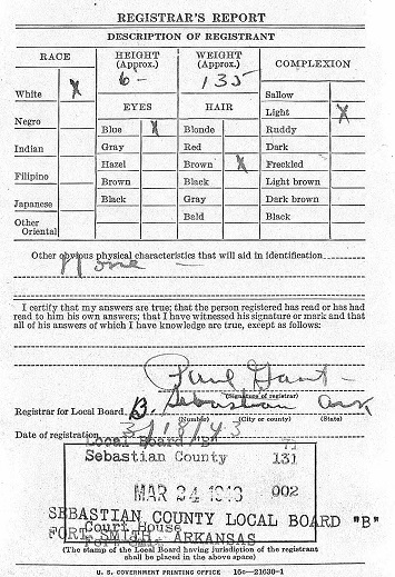 March 18, 1943 John registered for the military draft at the Court House in Fort Smith,