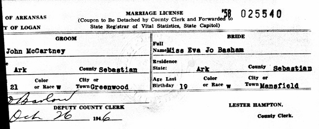 Greenwood Sebastian Co., Ar. married Eva Jo Basham a resident of Mansfield