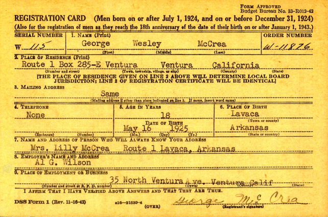 George registered for the military draft May 17, 1943 at Ventura, California.