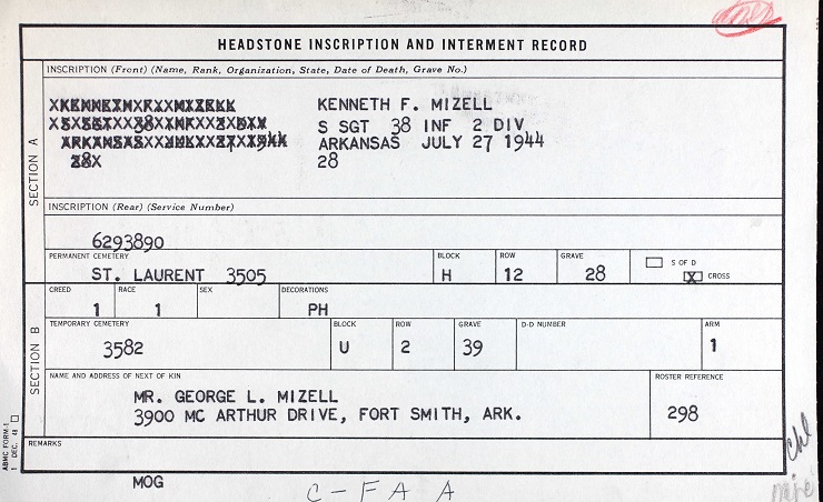 2nd Infantry Division. On July 27, 1944 S/Sgt Kenneth F. Mizell was Killed in Action.