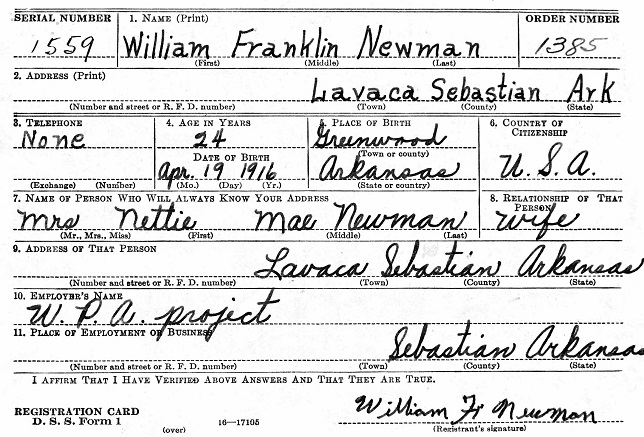 William "Billy" Franklin Newman was born April 19, 1916 in Greenwood, Sebastian Co.,