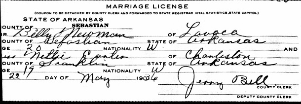 Arkansas to Jeff Leander and Mattie Boatman Newman. May 22, 1936