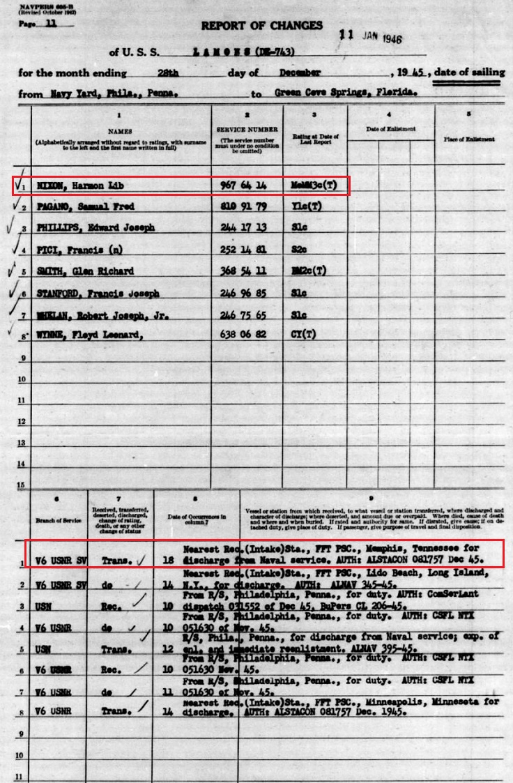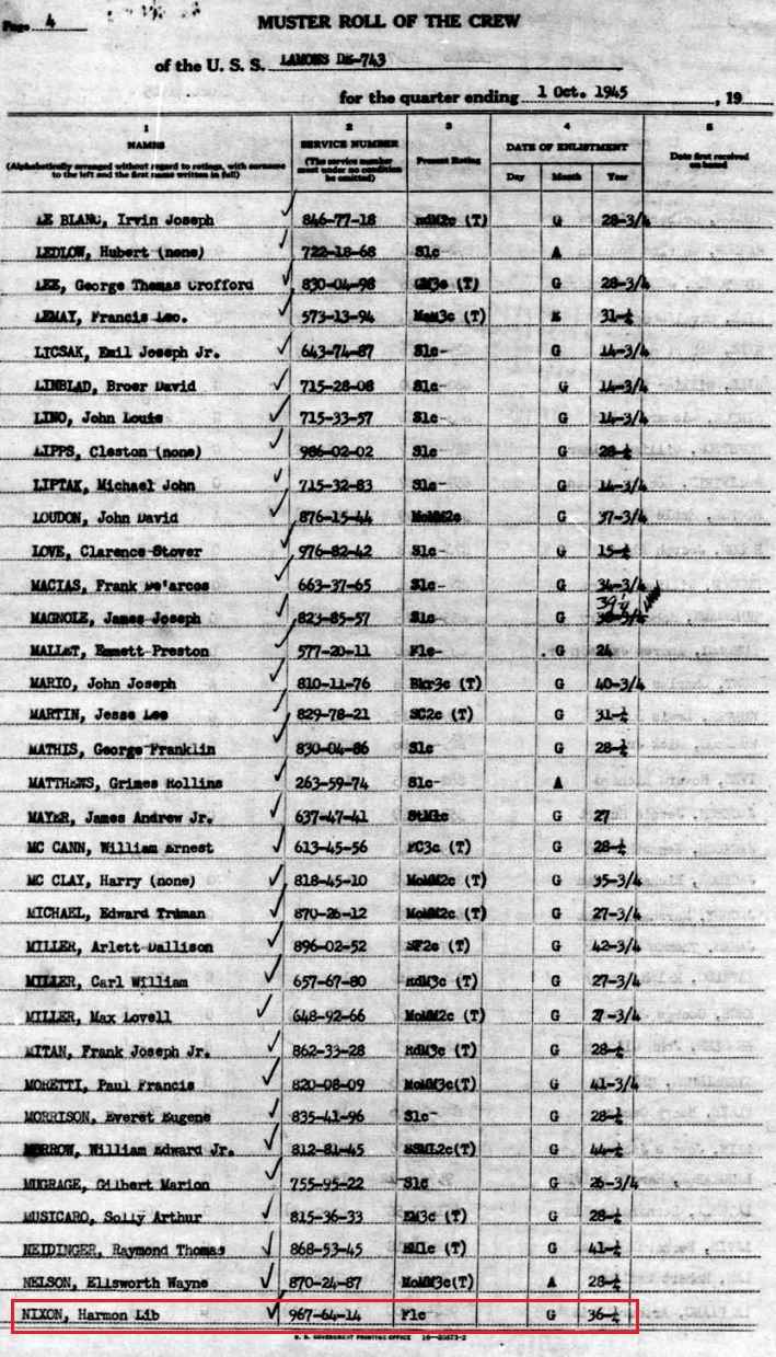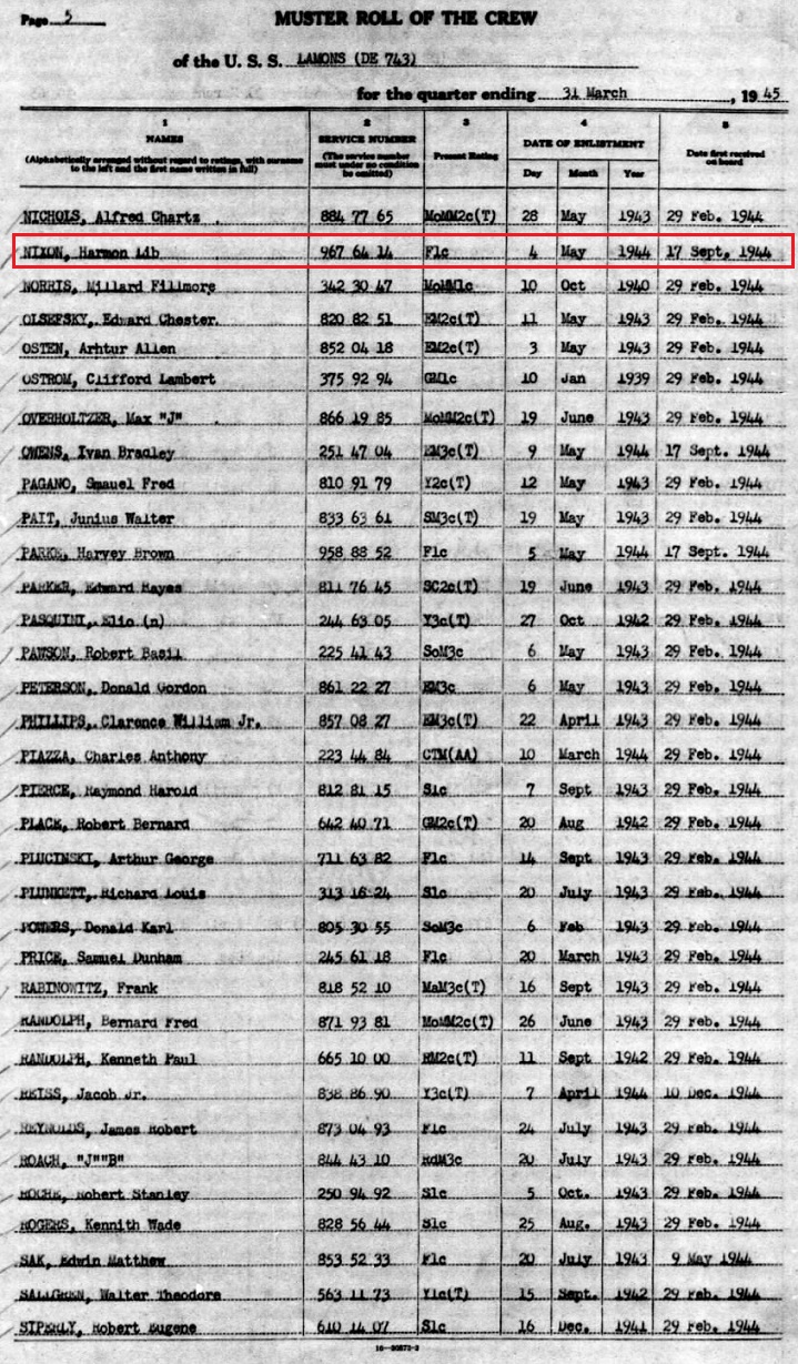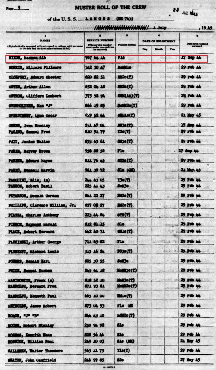 December 28 1945 muster shows his rank as MoMM3c or Motor Machinist's Mate 3rd Class.