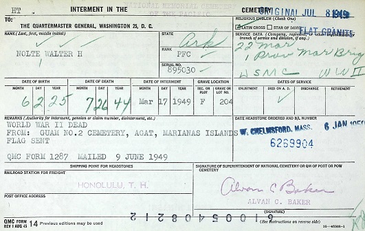 Pvt Nolte was killed fighting on Guam July 26, 1944. He was buried