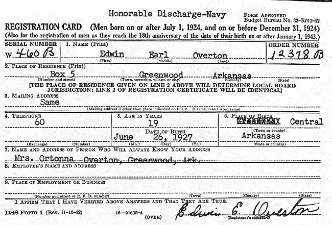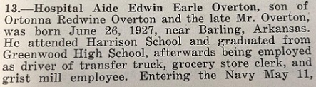 Edwin Earle Overton was born June 26, 1927 in Central City, Sebastian Co., Ar. to