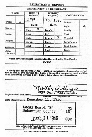 Earle registered for the military draft December 11, 1946 at Fort Smith, Sebastian