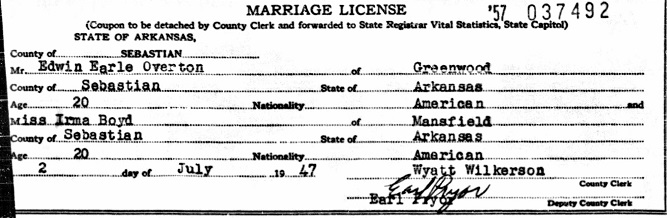 Son of Leo and Jenny Ortonna Redwine Overton. He married Irma Boyd on July 3, 1947.