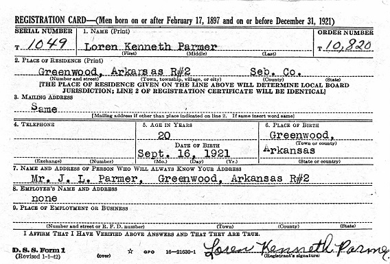 February 16, 1942 at age 20 Loren filled out his registrarion card at Sebastian Co., Ar.