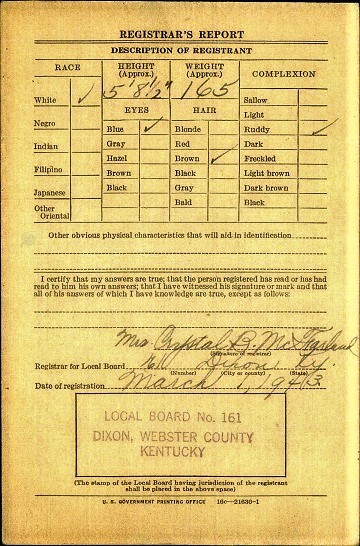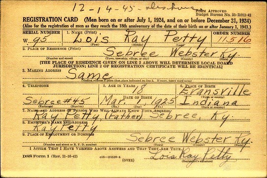 Lois Ray registered for the military draft March 1, 1943 at Dixon, Webster