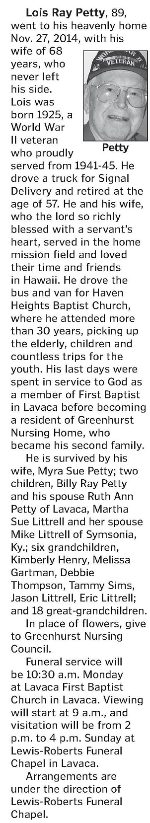 Lois Ray Petty passed away November 27, 2014. His burial was at the