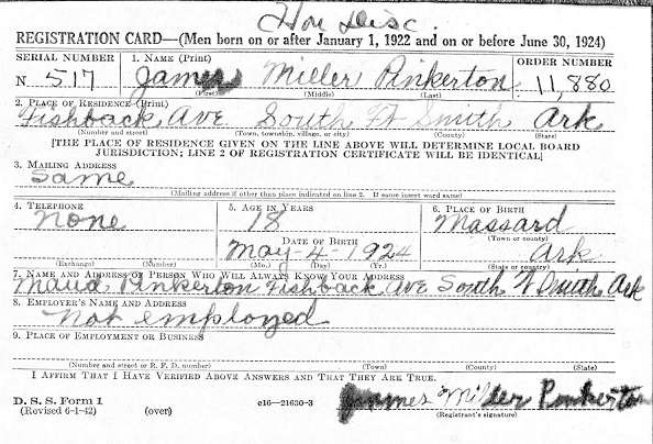 James Miller Pinkerton was born May 4, 1926 in Massard, Sebastian Co., Ar.