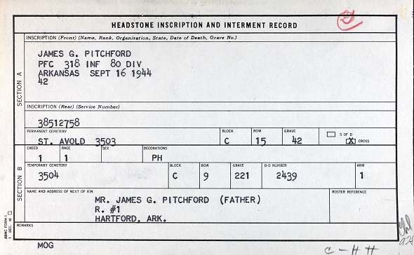 On the 16 Sep 1944 Pfc Pitchford was killed in action in the vicinity of Atton, France.