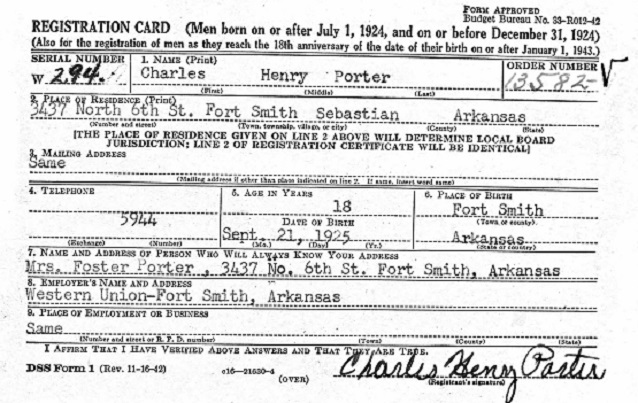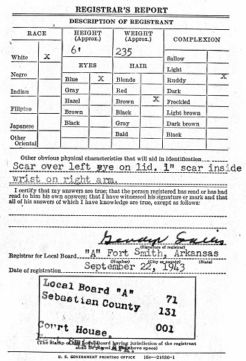 September 22, 1943 he registered for the military draft at the courthouse in Fort Smith, Arkansas