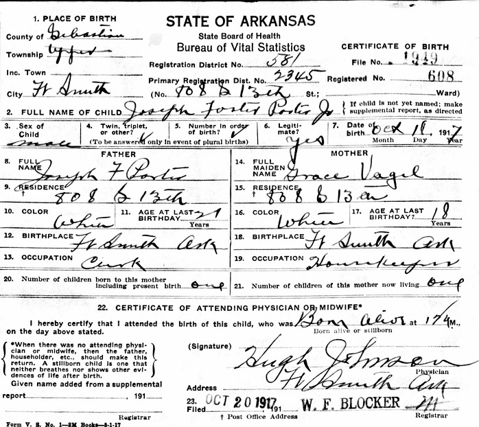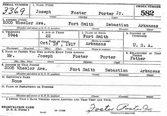 Joseph Foster Porter, Jr. was born Oct 18, 1917 in Fort Smith, Sebastian Co.,