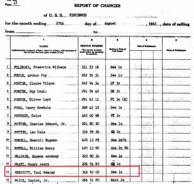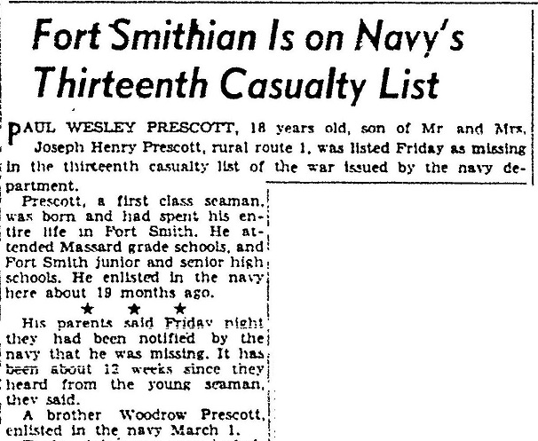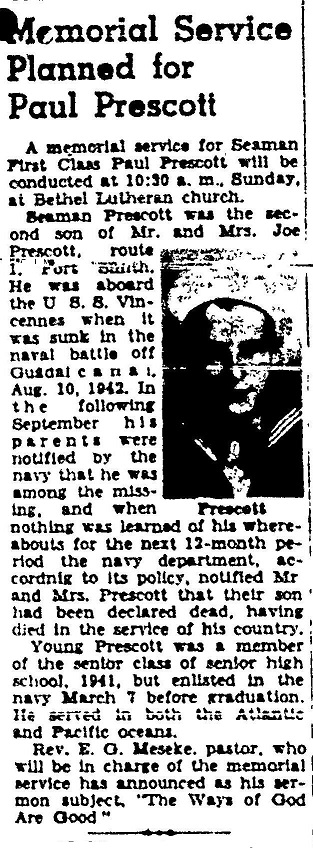 In August 1943 S1 Paul Wesley Prescott was reported as MIA in the Solomon Islands.