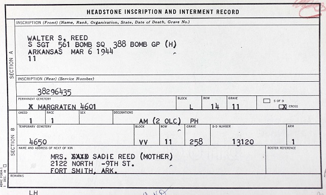 S/Sgt Reed is buried or memorialized at Plot L Row 14 Grave 11, Netherlands American