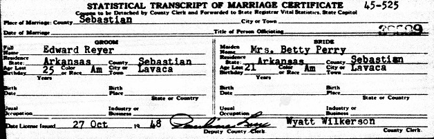 Edward married Betty Perry in Lavaca, Sebastian Co., Ar., both being residents