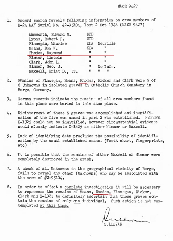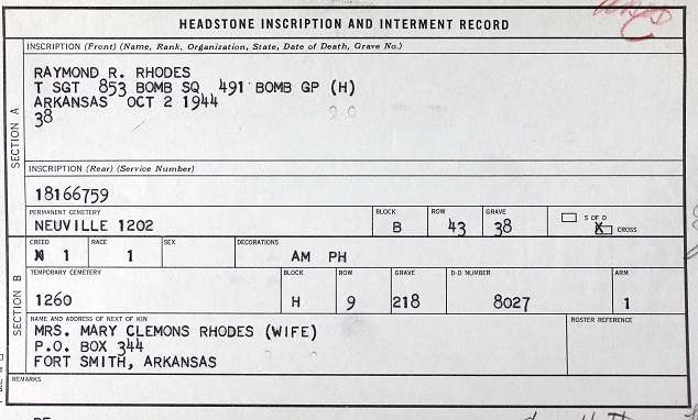 TSgt Rhodes is buried at: Plot B Row 43 Grave 38 Ardennes American Cemetery Neupre,
