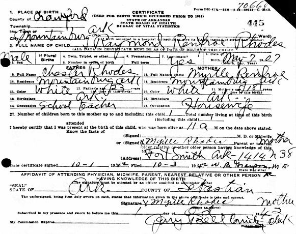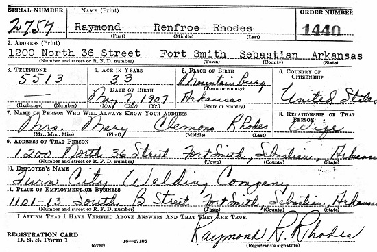 Raymond Renfroe Rhodes was born May 7, 1907 in Mountainburg, Crawford Co., Ar.