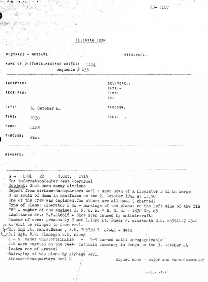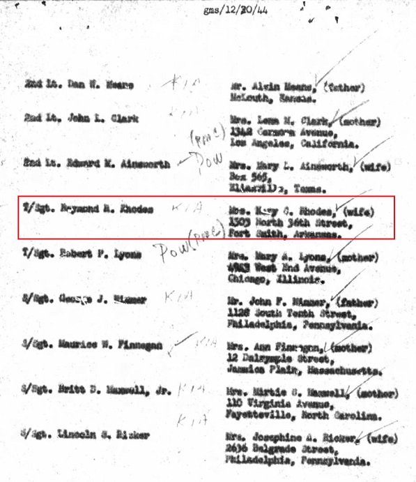 On Oct 2, 1944 TSgt Rhodes' plane was shot down by antiaircraft fire at 13.50