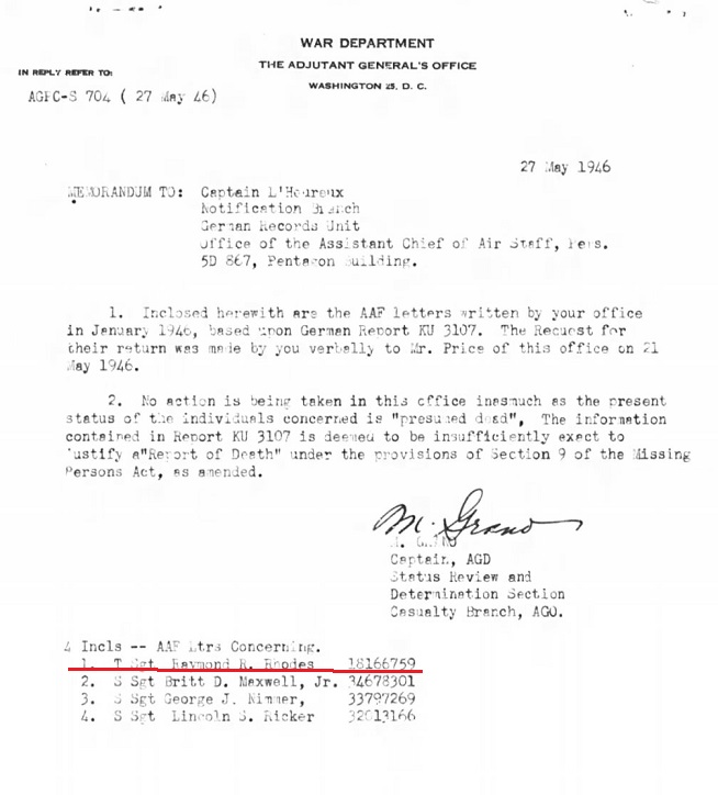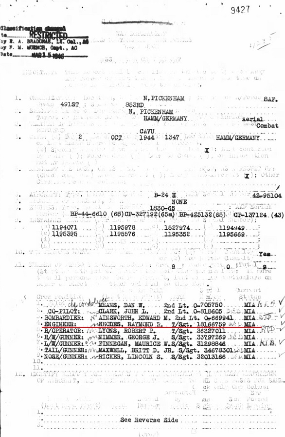TSgt Raymond R. Rhodes was attached to the 853rd Bomber Squadron, 491st Bomber