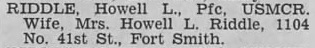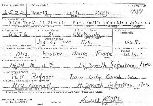 Howell Leslie Riddle was born January 2, 1910 in Clarksville, Johnson Co., Arkansas to