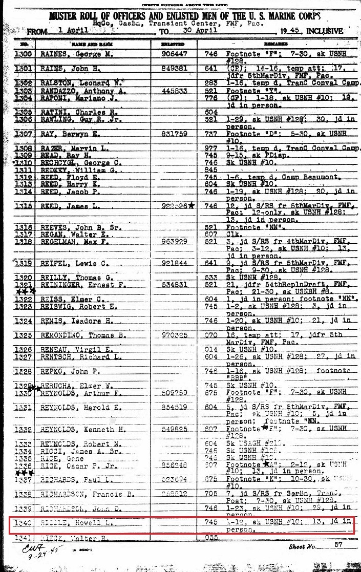 April 1945 he is found on a Marine Corp Muster list. Copy below. PFC Howell was discharged