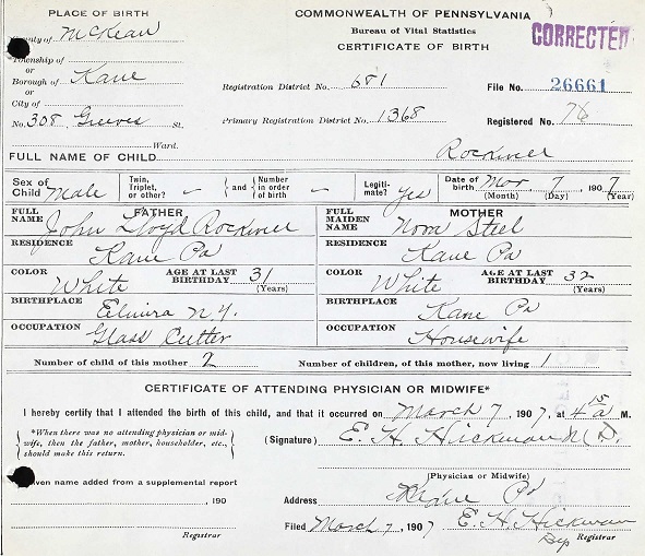 John Allan Rockwell was born March 7, 1907 in McKeen, Kane Co., Pennsylvania to