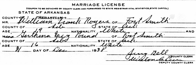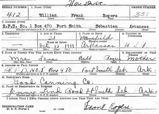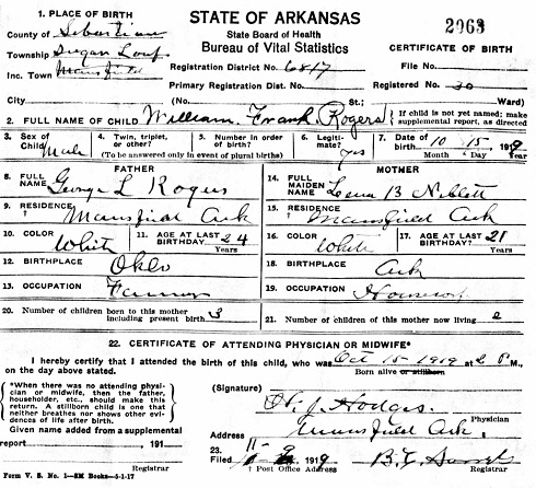 William Frank Rogers was born October 15, 1919 in Mansfield, Sugar Loaf Twsp, Sebastian, Co. Arkansas to