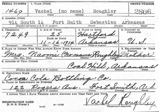 Vachel Roughley was born Novemeber 16, 1914 at Hartford, Sebastian Co., Ar. to